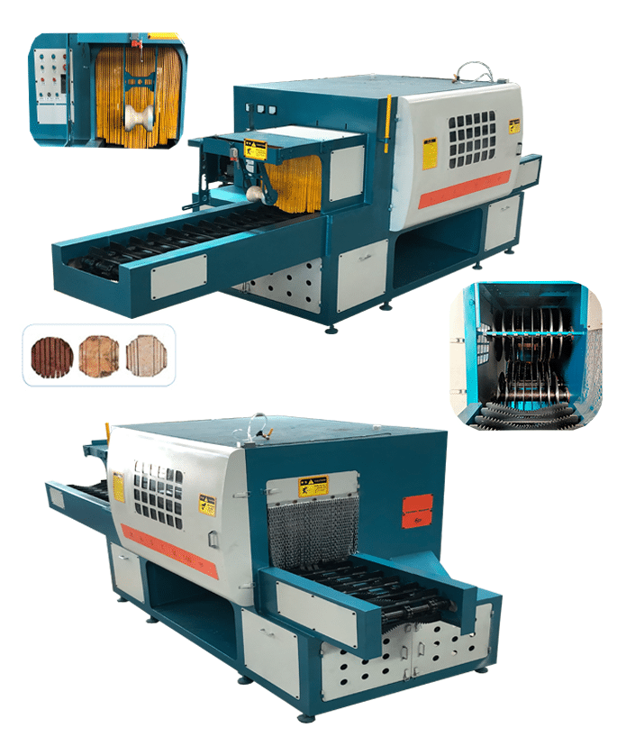 送 料:采用優(yōu)質(zhì)鏈條輸送,機上配有的變頻智能調(diào)速器,可以對大小木料的進料速度實行自由調(diào)速。原木可以實現(xiàn)自動分中,機上還配有限位開關(guān),防止超去規(guī)格木料進入,防止卡木避免對機器造成損壞。