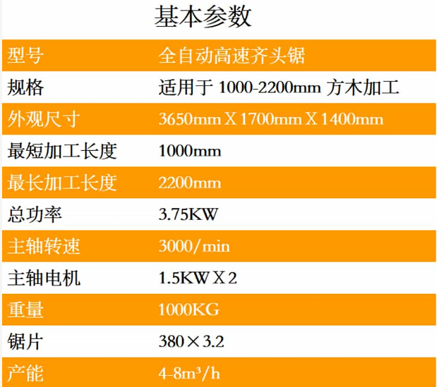 全自動高速齊頭鋸一體式機身設計、采用國標鋼材、結構科學、操作簡單、鋸面光滑、誤差小、效率高、故障率低、速度可調,一次可以鋸五塊木板,最短1米,最長2.2米,中間尺寸可隨意調節
